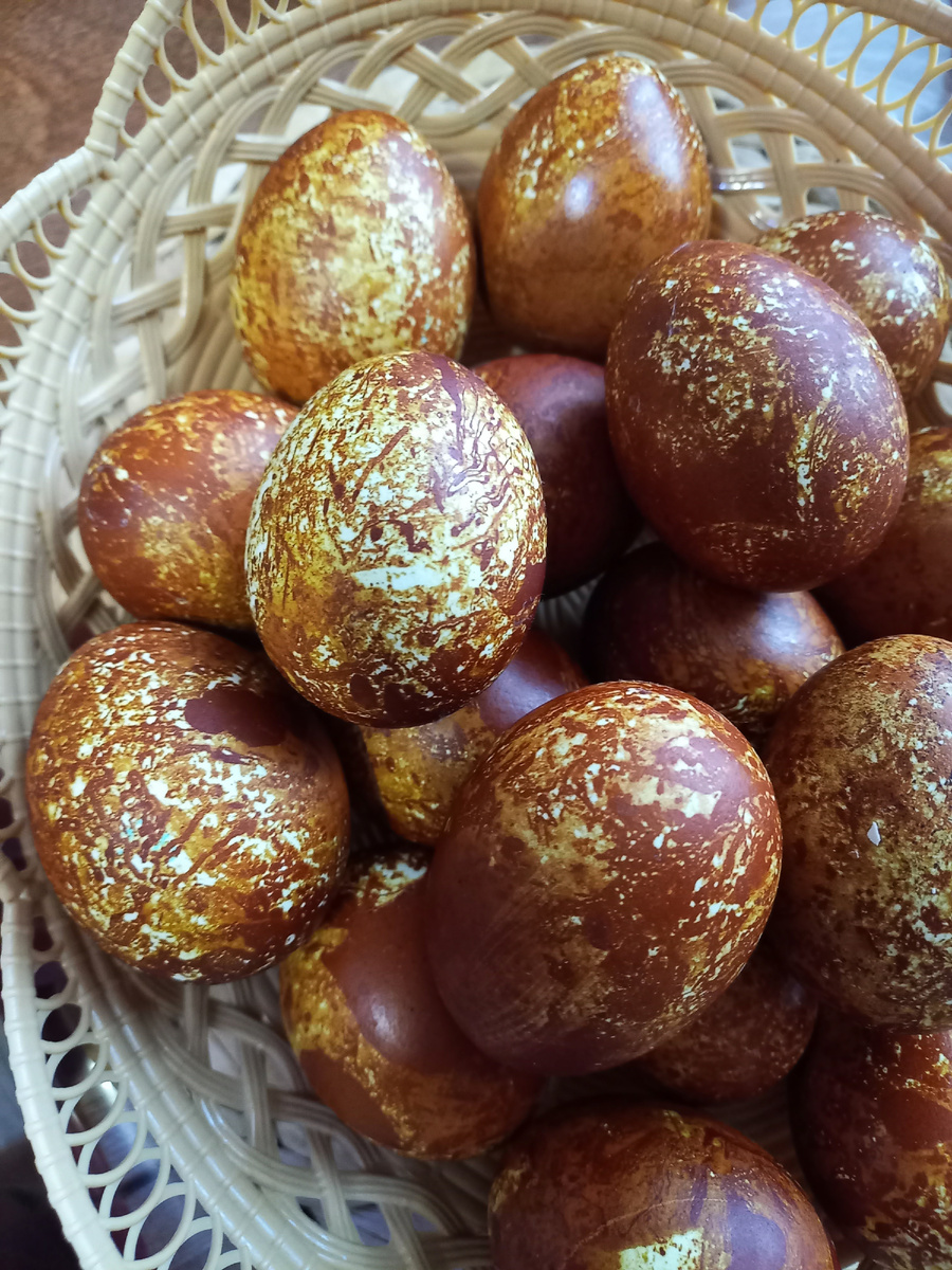 Мой новый способ покраски яйц на Пасху! Всем доброго времени суток,всю свою жизнь я красила яйца просто луковой шелухой,мне так кажется вкуснее! В этом году решила сделать немножечко по новому! Мне так посоветовала одна девочка,её мама всю жизнь так красит.Замачиваешь на час в луковую шелуху