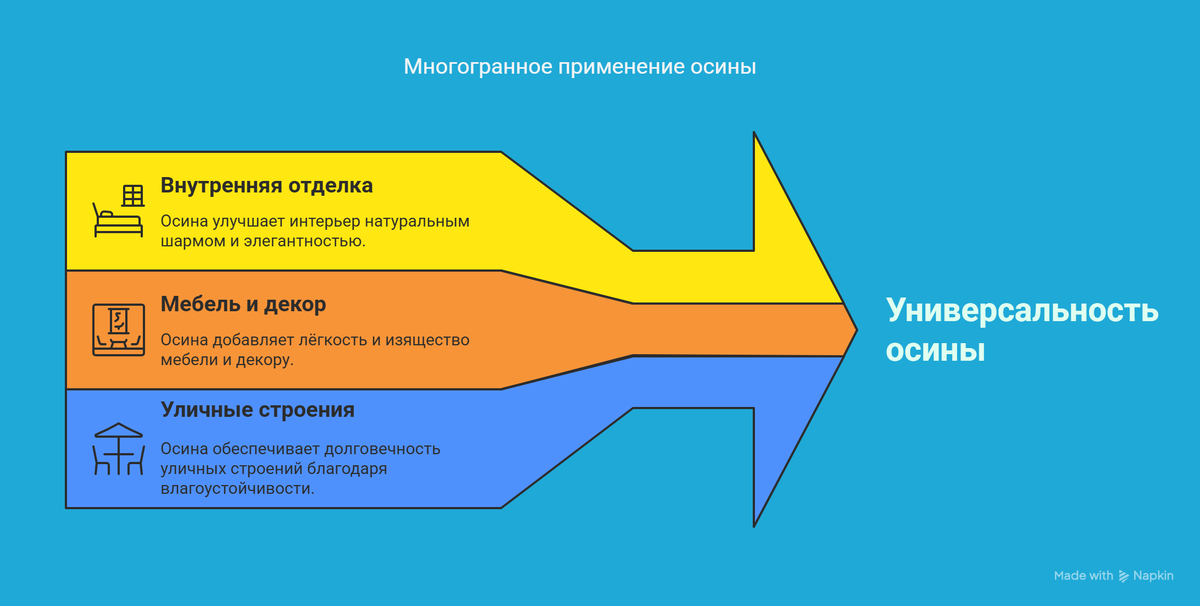 Осина вдвое легче дуба, но при этом не уступает по жёсткости сосне. Это значит, что ваши конструкции будут надёжными, а монтаж — более простым и быстрым.