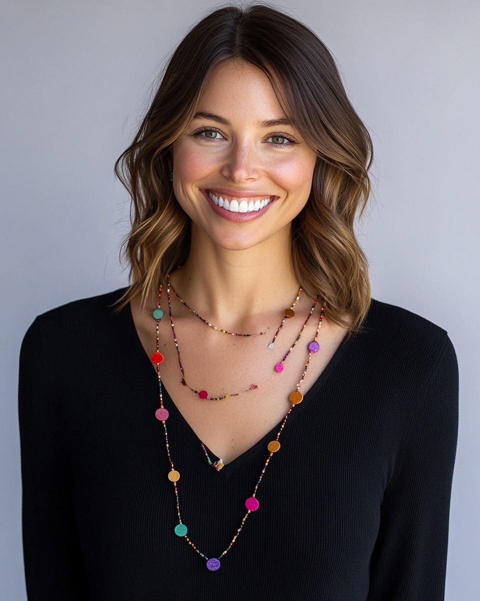 Создано на основе запроса: A smiling woman wearing a black top, a long necklace with colorful circles and round beads on a chain, in the