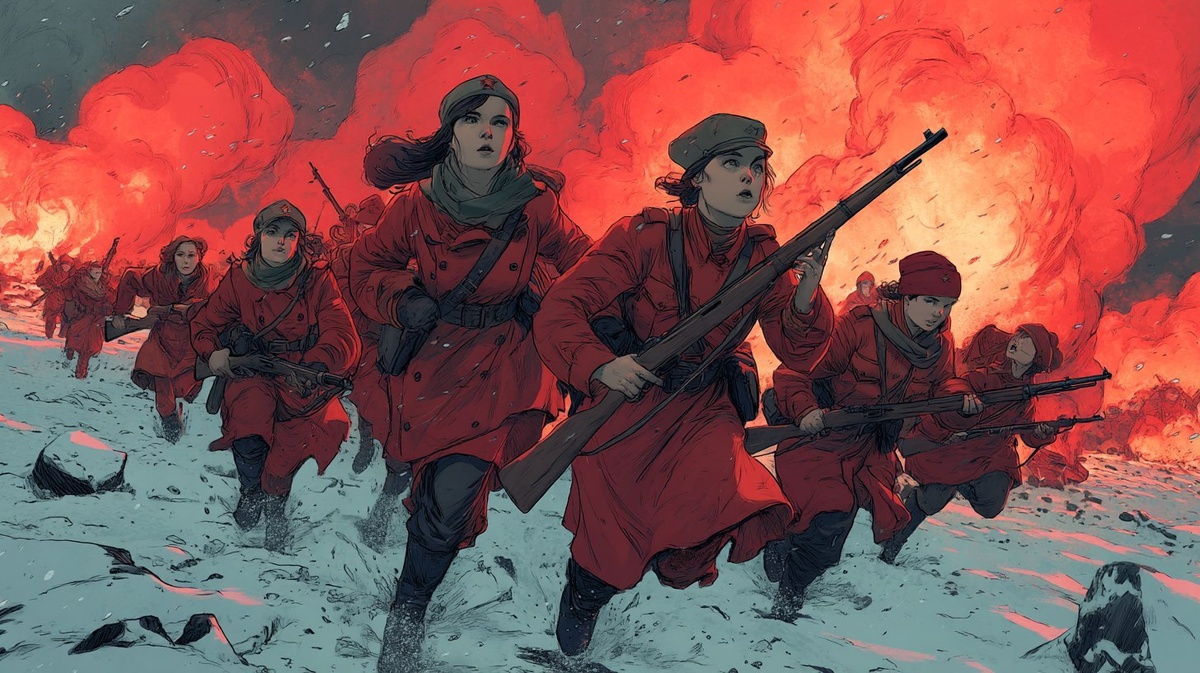 Создано на основе запроса: Stylized dramatic comic book illustration of Soviet female soldiers rising from muddy snow and charging forward