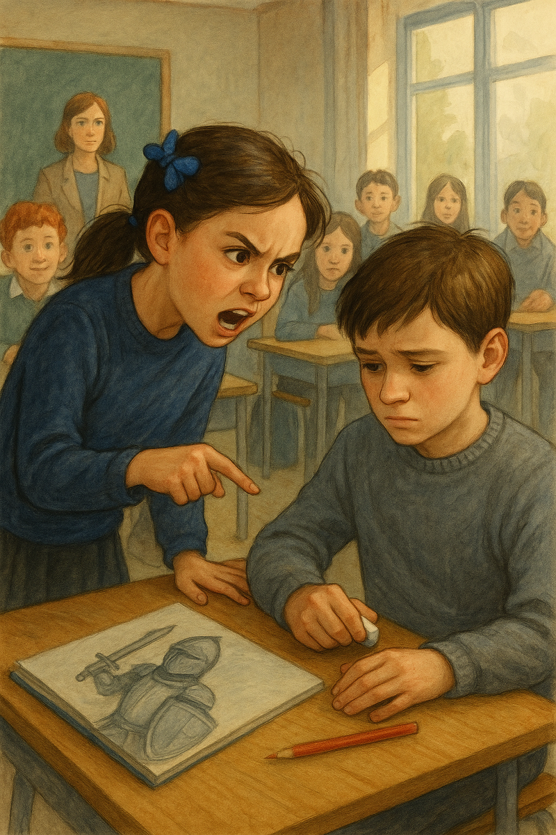 Класс 6-Б шумел, как обычно перед первым уроком. Учительница истории, Марина Сергеевна, задерживалась. Лёва сидел за последней партой у окна. С тихим лицом, в сером свитере. Алина, наоборот, — громкая, синие заколки, острые взгляды. Окружённая вниманием, будто всё происходило ради её реакции.