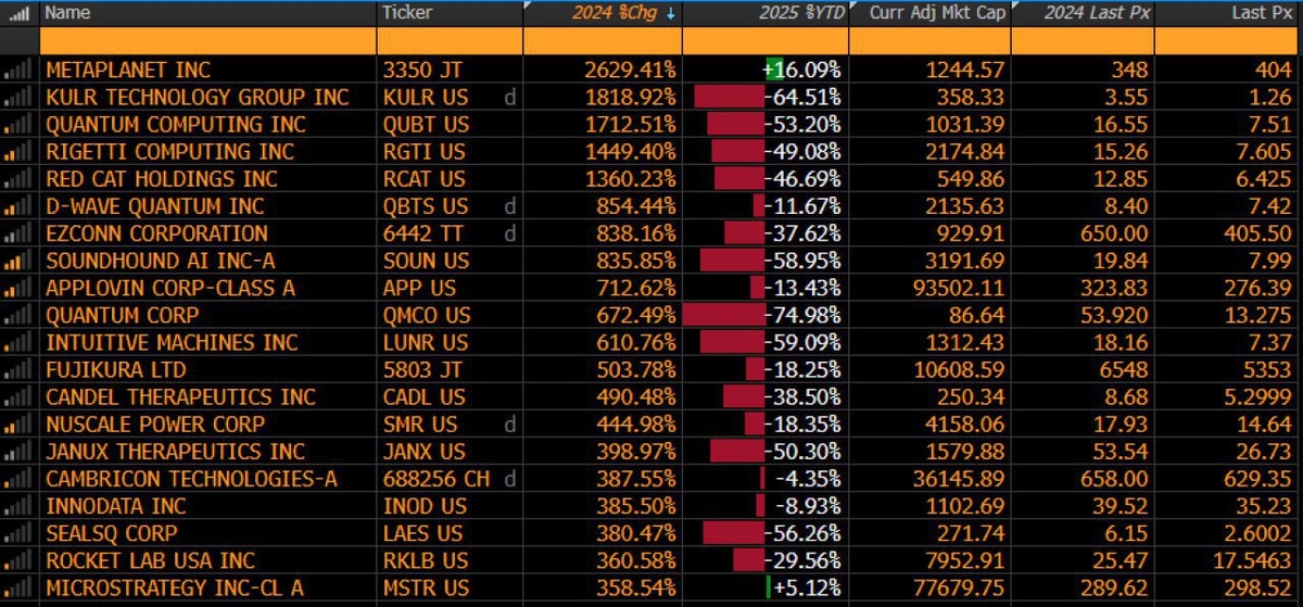🚨 FYI: Out of the top 20 hottest stocks from 2024, just two are still riding high in 2025. Spoiler alert: They're both Bitcoin treasury companies! 💰🚀 - Simon Gerovich, CEO of Metaplanet
