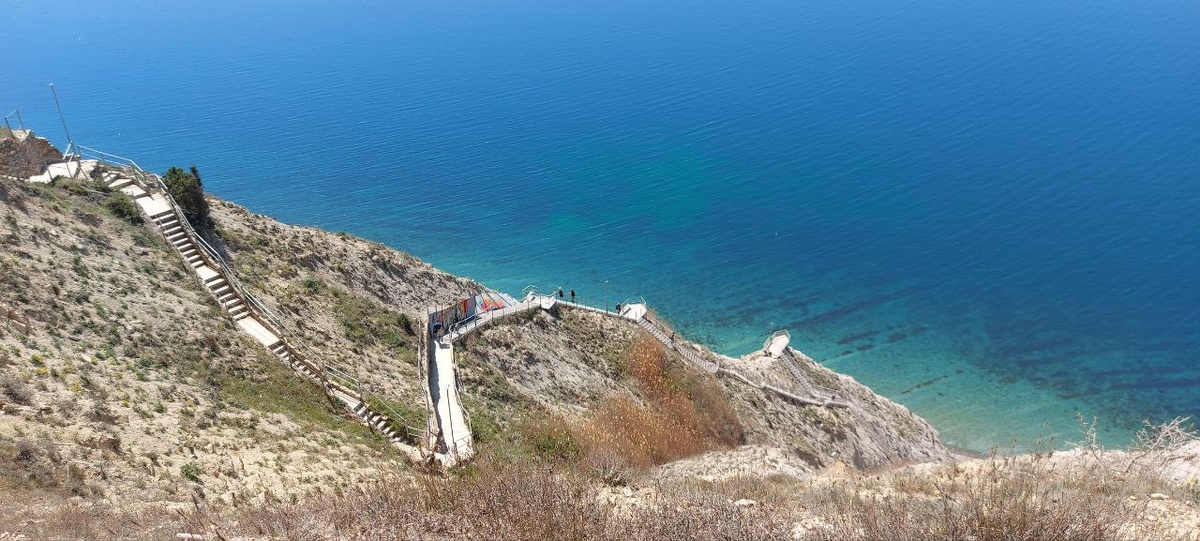 Многие слышали про место в Анапе под названием 800 ступеней. В 9 км от Анапы, в посёлке Супсех, находится Лысая гора. Здесь начинаются Кавказские горы. В этом месте расположен самый длинный спуск к морю, который и называют 800 ступеней. Мы еще не разу там небыли и решили сегодня посетить это место. Погода обещала быть отличной, на небе ни тучки, ветра почти нет. Красота! Позавтракав, мы вышли из дома, полюбовались весенними цветами, насладились их запахом, который органично дополнял свежий утренний горный воздух. Сели в машину и отправились в Анапу. Мы живем в станице, в 20 километрах от города-курорта. Оставив машину на одной из парковок, мы решили пешком прогуляться по побережью, спускаться к морю 800 ступеней мы не собирались, останавливает обратный подъем. По пути к нашей цели, а мы прошли примерно 5 км по побережью в подъем, мы наслаждались свежим морским воздухом и великолепными видами на море, которое сегодня было настолько спокойным, чистым и прозрачным, что с большой высоты