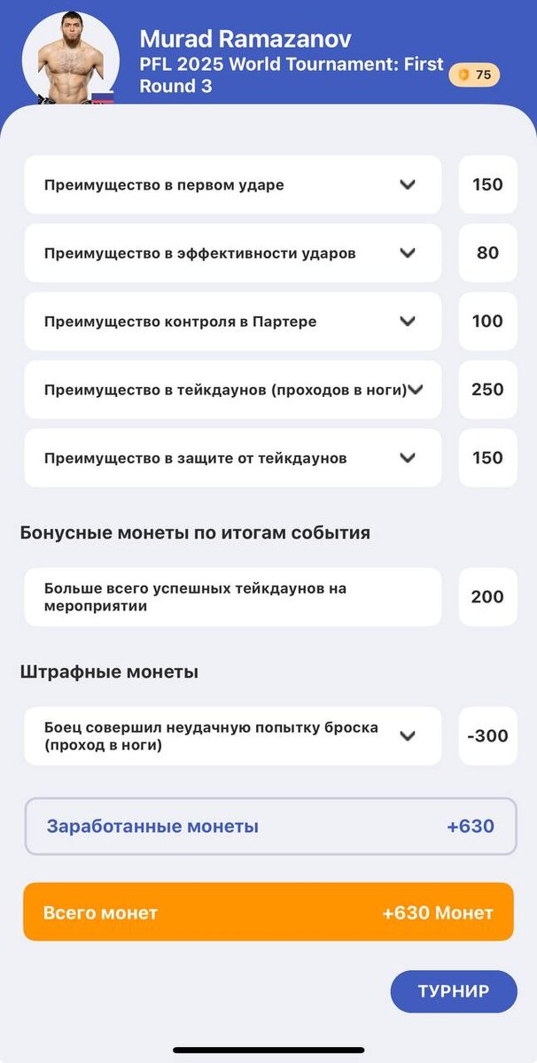 Админ прислушался к мнению аудитории и включил в состав своей команды игрока прогнозов Stats Fight — Мурада Рамазанова. Однако ожидания от его участия оказались скромнее: он принес всего лишь 630 монет. Поделитесь, кто из бойцов разочаровал вас или же напротив, порадовал неожиданным большим количеством монет? 👇🏻
