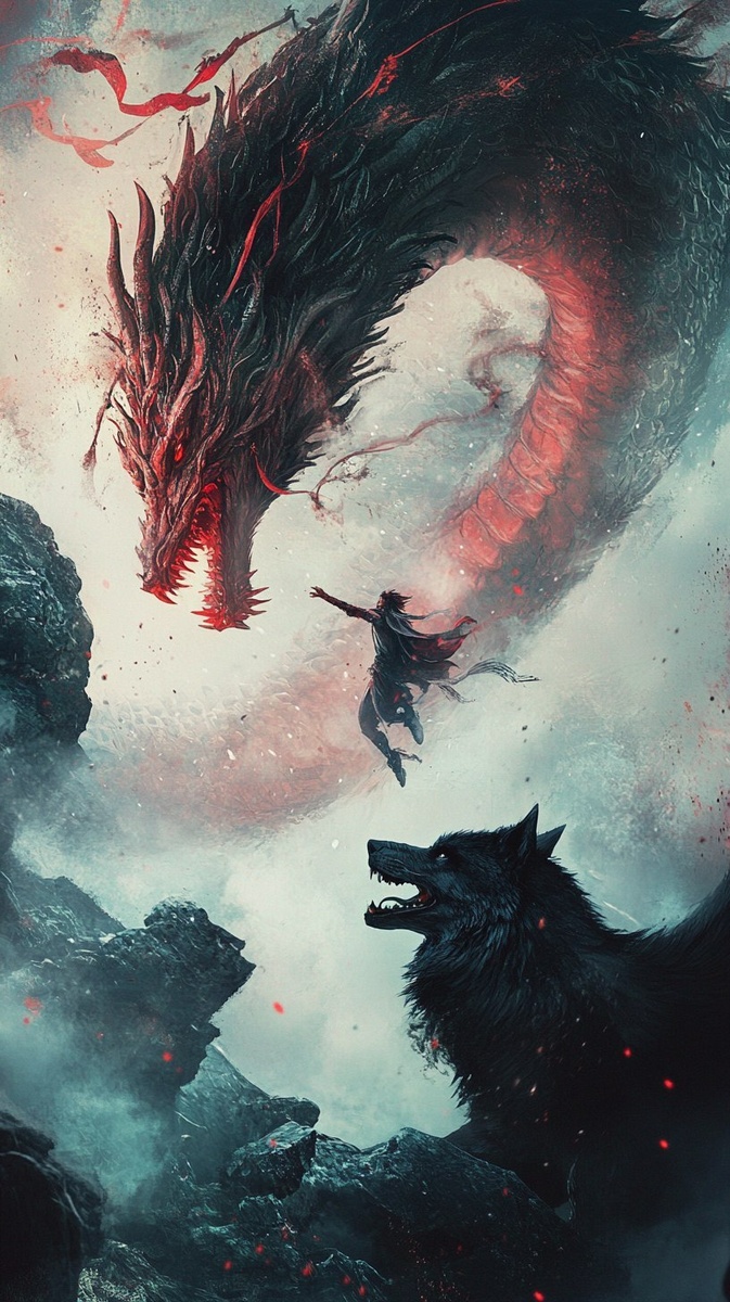 Создано на основе запроса: A huge dragon is fighting a black direwolf