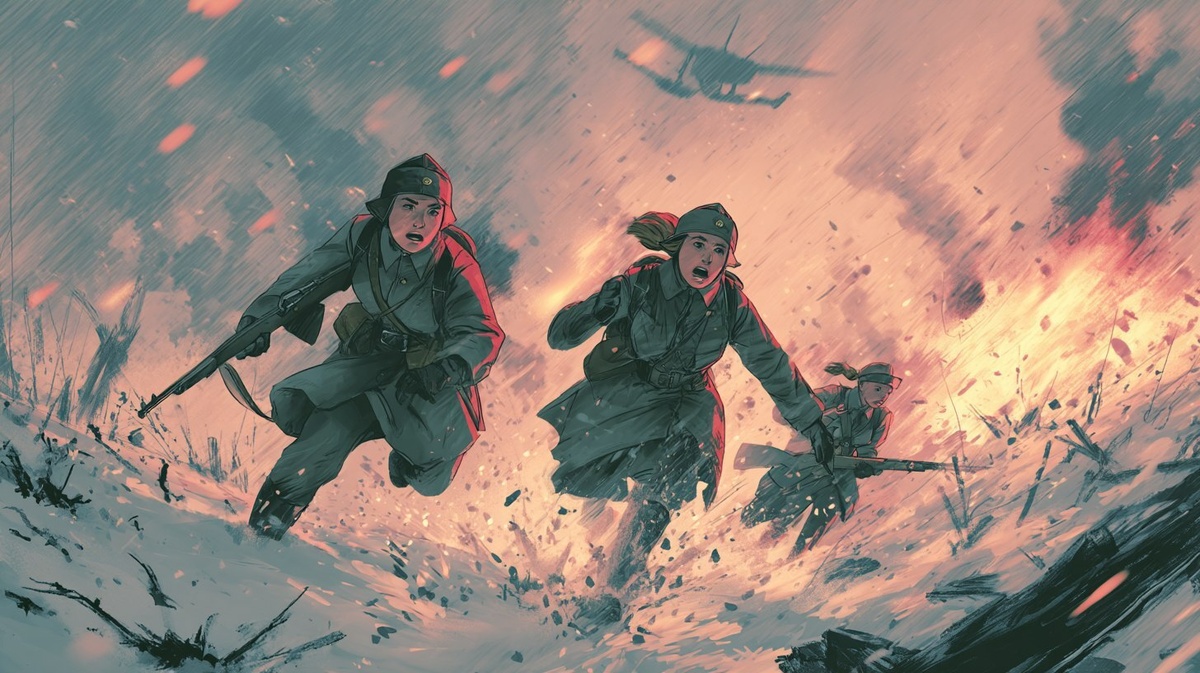 Создано на основе запроса: Stylized dramatic comic book illustration of Soviet female soldiers diving to the ground in panic, snow and mud