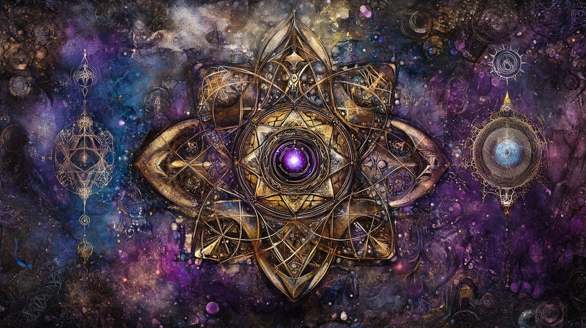 Создано на основе запроса: Using PURPLE, an Abstract, surrealistic depiction of the Sacred Kabbalistic Language of symbols, mathematics, music, and magic. sacred geometry quantum code, 64K UHD resolution, Topaz Gigapixel clarity,