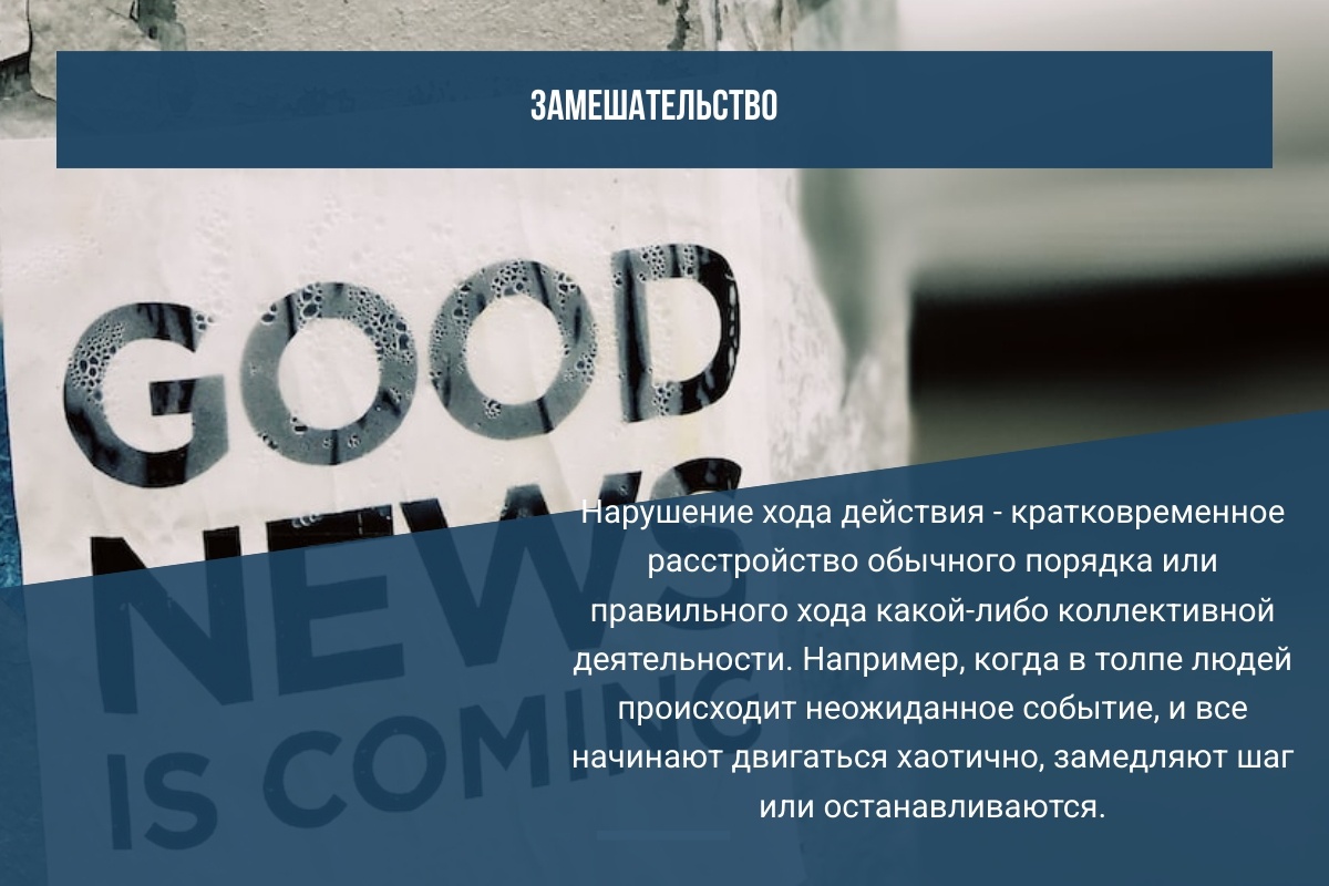 - Нарушение хода действия - кратковременное расстройство обычного порядка или правильного хода какой-либо коллективной деятельности. Например, когда в толпе людей происходит неожиданное событие, и все начинают двигаться хаотично, замедляют шаг или останавливаются.