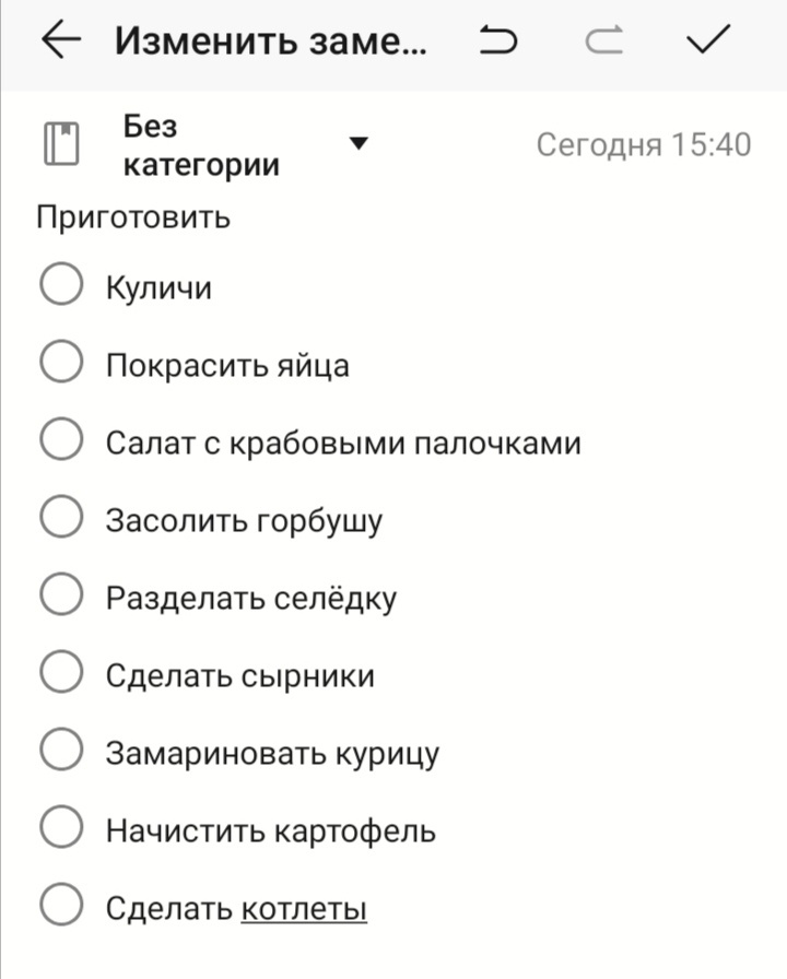 Котлеты я вчера наделала, а салат с крабовыми палочками сделаю завтра утром.