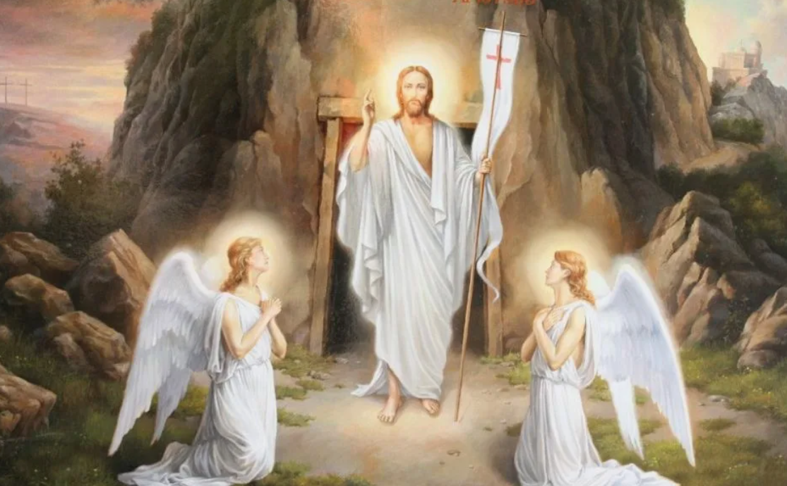 По прошествии субботы на рассвете первого дня недели пришла Мария Магдалина и другая Мария посмотреть гроб. И вот сделалось великое землетрясение, ибо ангел Господень сошедший с небес, приступив, отвалил камень от двери гроба и сидел на нём.
