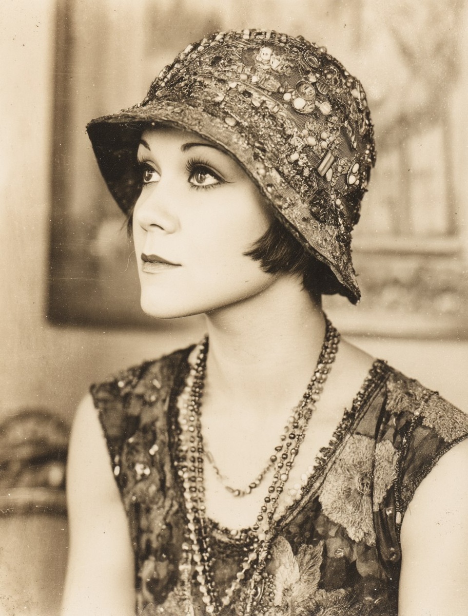Создано на основе запроса: 1920s flapper beauty her bobbed hair framed by a crustacean-colored cloche hat stitched with mirrored sequins and