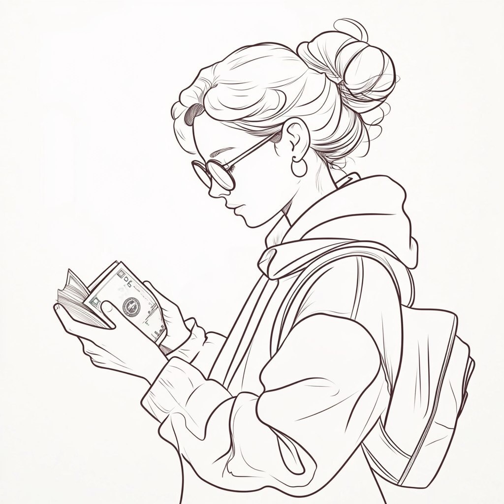 Создано на основе запроса: Simple line drawing of a woman taking money out of her wallet, minimalist style, clean white background