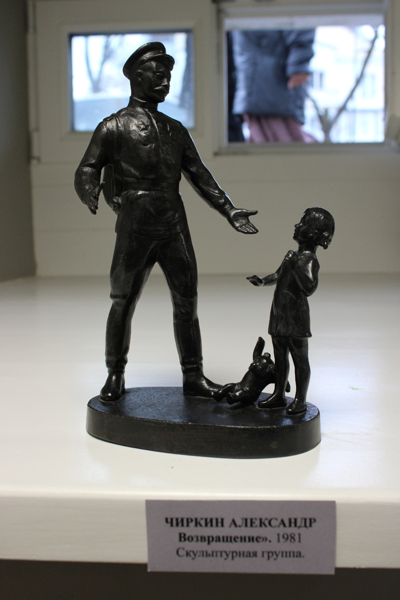 В преддверии Пасхи в Музее живописи Валентина Сидорова "На тёплой земле" открылась выставка "Семейное собрание". Известный журналист и меценат Александр Вихров и его супруга Любовь поделились с тверским зрителем своей коллекцией произведений искусства разных лет - в нее вошли графика, живопись, скульптура и декоративный фарфор. В экспозиции есть работы, напоминающие о Великой Отечественной войне и Победе, со дня которой скоро исполнится 80 лет. Например, эта небольшая скульптура. Или вот такое декоративное нарядное блюдо производства Императорского фарфорового завода с майским салютом, немного напоминающим одуванчики, на фоне старинного храма. Автор Мария Матвеева изобразила одну из ярославских церквей. Большой интерес гостей на открытии вызвала работа Павла Соловьева, изображающая Ржевский мемориал Советскому солдату. Художник писал картину, когда памятник был еще не достроенным и люди туда практически не приходили. В названии работы заключены горечь потерь, которые понесла в годы в