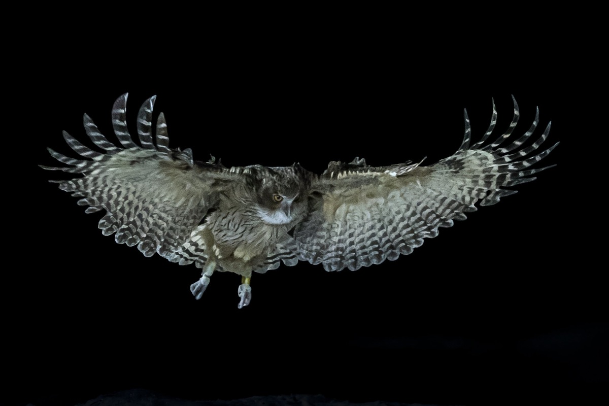 Представьте себе: ночь, тишина, и над рекой бесшумно скользит тень с огромными крыльями. Это не мифический дракон, а самая большая сова в мире — рыбный филин. Размах крыльев достигает 2 метров! Хотите узнать, что делает эту сову настоящей королевой ночного неба? Погрузитесь в ее удивительный мир! Рыбный филин – это не просто большая птица, это настоящий рекордсмен среди сов. Самцы весят около 3,5 кг, а самки, как настоящие дивы, могут потянуть до 4,6 кг. Чтобы понять масштабы, представьте: эта сова тяжелее, чем три средних домашних кота вместе взятых! А ее крылья? Они такие широкие, что могли бы послужить зонтиком в дождливый день. Размах в 2 метра – это как длина небольшого автомобиля. Только посмотрите, как она летит над рекой с добычей в клюве. Но не думайте, что она использует свои размеры, чтобы пугать всех подряд. Эта сова – мастер скрытности. Ее перья устроены так, что полет почти бесшумен. Даже если она пролетит прямо над вашей головой, вы скорее почувствуете легкий ветерок, ч