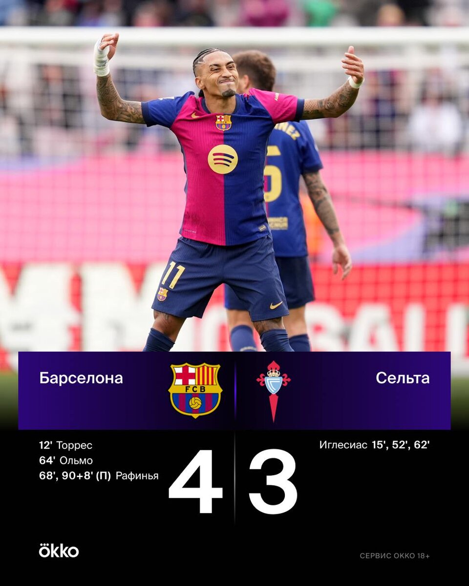 Обычный матч «Барселоны». Ничего интересного 🤯 Всего лишь Иглесиас из «Сельты» оформил хет-трик, а «Барса» отыгралась с 1:3 и забила победный на 90+8. Рафинья — гений. 🔥 — на характере!