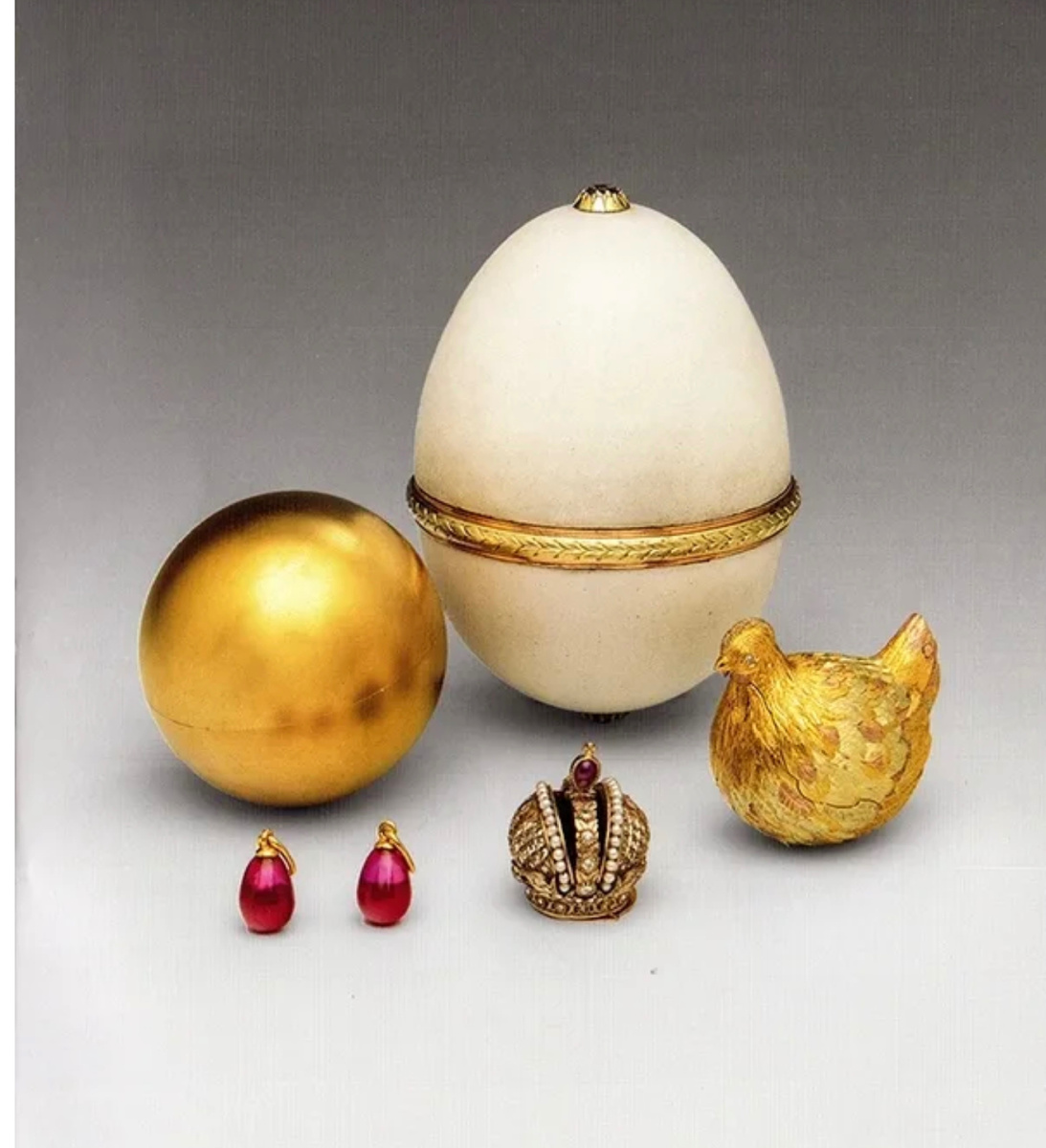 Снаружи это было белое яйца, а внутри скрывались сюрпризы: золотое яйцо, курочка, рубиновые подвески и копия императорской короны в миниатюре.