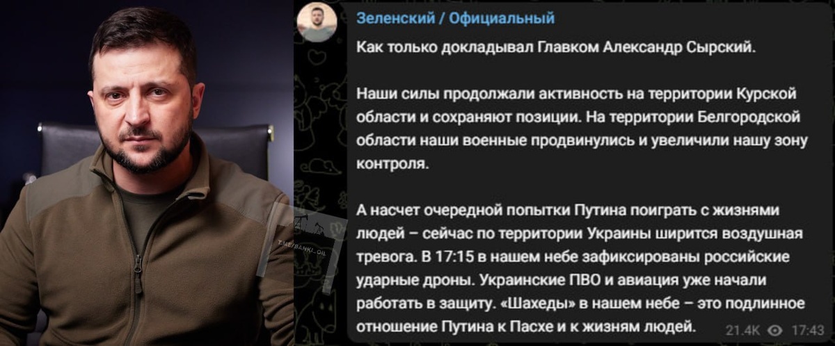 Зеленский проигнорировал предложение Путина о пасхальном перемирии. Вместо этого он заявил о продвижении ВСУ в Курской и Белгородской областях.