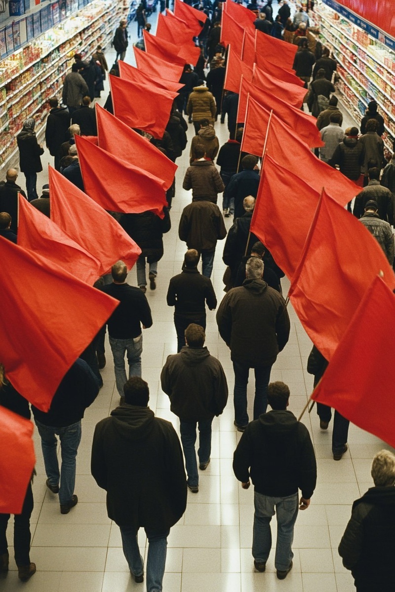Создано на основе запроса: crowd demonstrating with red flags advancing through supermarket aisles