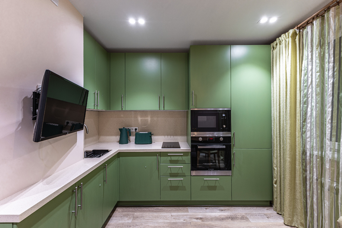 - Вместо микроволновки на столешнице — встроенная в верхний шкаф.