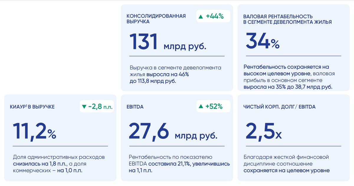 • Выручка в 2024 году выросла на 44% год к году до 130,9 млрд рублей. Компания увеличила своё присутствие до 10 регионов, при этом продажи в Москве выросли в 1,5 раза до 61,4 млрд рублей.