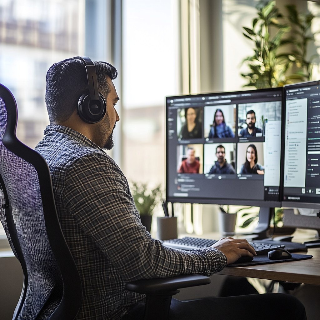 Создано на основе запроса: A man sitting in a modern office chair, in front of a computer setup. He is wearing headphones and is fully focused on the computer screen. On the screen, there is a Google Meet meeting with 11 visible windows, but only 5 people are visible in the video boxes, participating in the meeting. The environment is controlled and professional, with a clean desk, soft lighting, and a neutral background. The man is looking attentively at the computer, with a focused and professional posture. The focus is on his virtual interaction with the meeting participants. The scene conveys an atmosphere of effective and productive remote work. --- Автоперевод: Человек, сидящий в современном офисном кресле, перед компьютерной установкой. Как тебе такая картинка? 🤔 https://dzen.ru/id/65c0c65c86e4f837c27b24d7 #ИИ #AI #нейросеть #midjourney #art