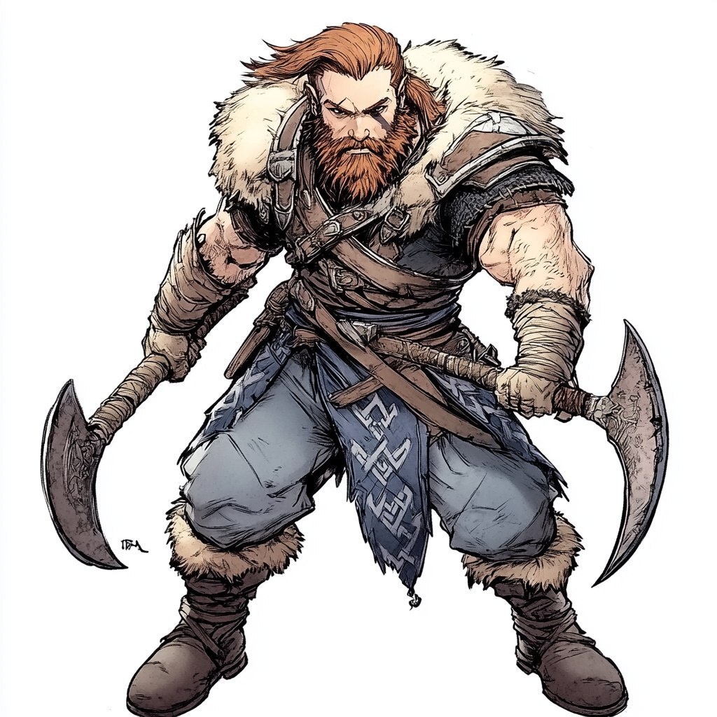 Создано на основе запроса: Fantasy concept illustration, Male, Dwarf, Long reddish brown hair, Shaved hair on the sides of the head, Thick reddish brown beard, Scar on right eye, Thief, Scruffy, Ragged, Dirty, Heavy leather armour, Two pickaxes of arms in the hands, Celtic style, White background, High quality, Exaggerated fighting pose