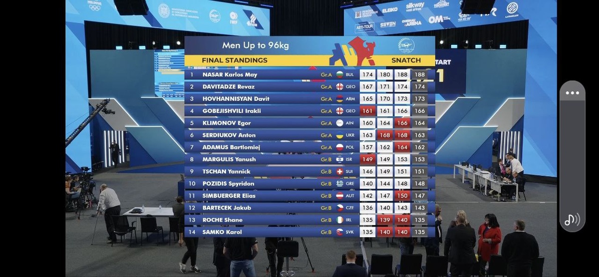 Егор Климонов, в/к 96 кг завершил выступление в рывке с результатом 164 кг