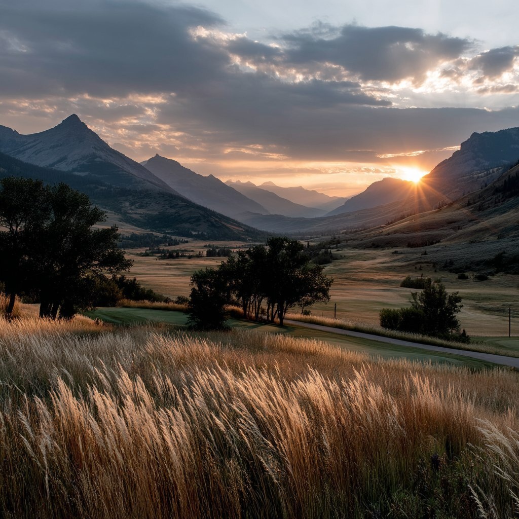 Создано на основе запроса: country crossover landscape, with the sun rising with yellow and pink hues, the grass and the mountains, in the distance