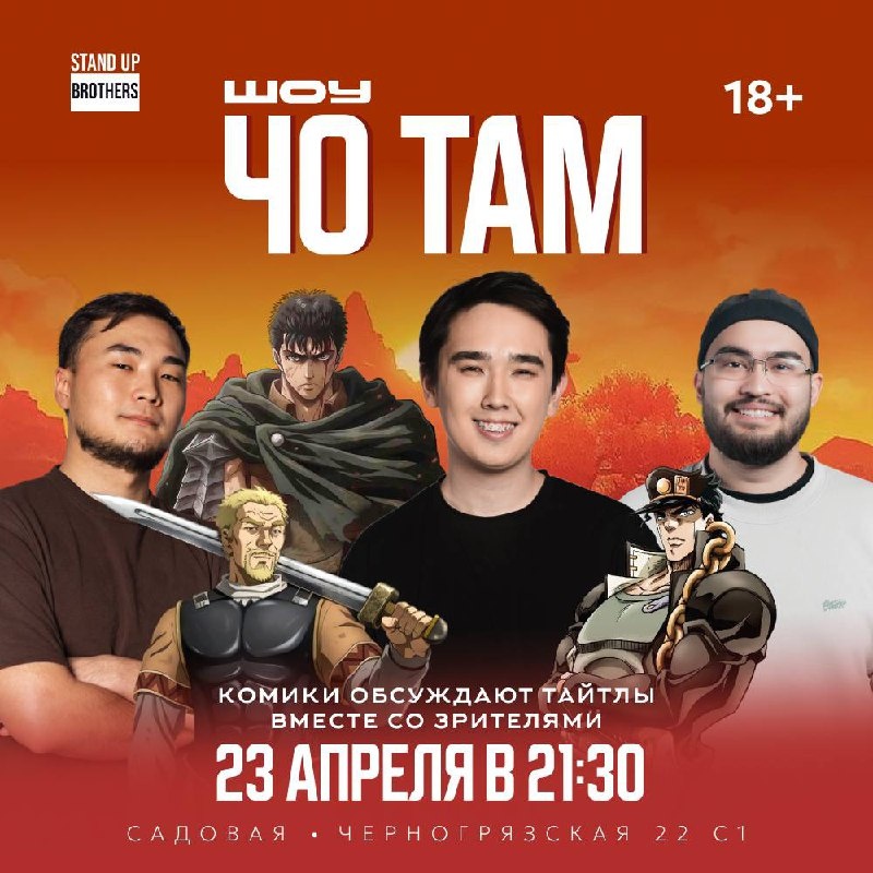 «Чо там?» — это шоу, где комики обсуждают аниме-тайтлы, находя смешное в сюжете, персонажах и клише. Мы спорим, шутим, устраиваем голосования и разбираем персонажей. Здесь можно не просто послушать, но и поучаствовать: предложить тему, высказать мнение и хорошо провести вечер. Комики: Мадияр Хакимов, Адиль Абдигаппар, Максат Мадали. 🎟️ Билеты от 1500р