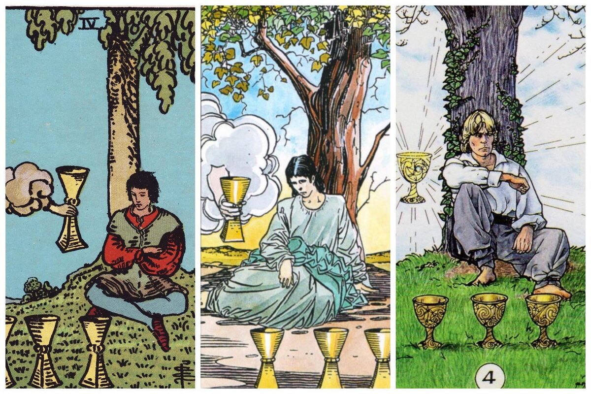 Общая характеристика карты: на четверке кубков мы видим молодого человека, сидящего у дерева. В некоторых колодах он сидит в позе медитации. В большинстве колод — в позе со скрещенными ногами и руками, то есть полностью закрытый. Перед ним стоят три пустые чаши и ему подается четвертая, наполненная, но он ее словно не замечает и не принимает.