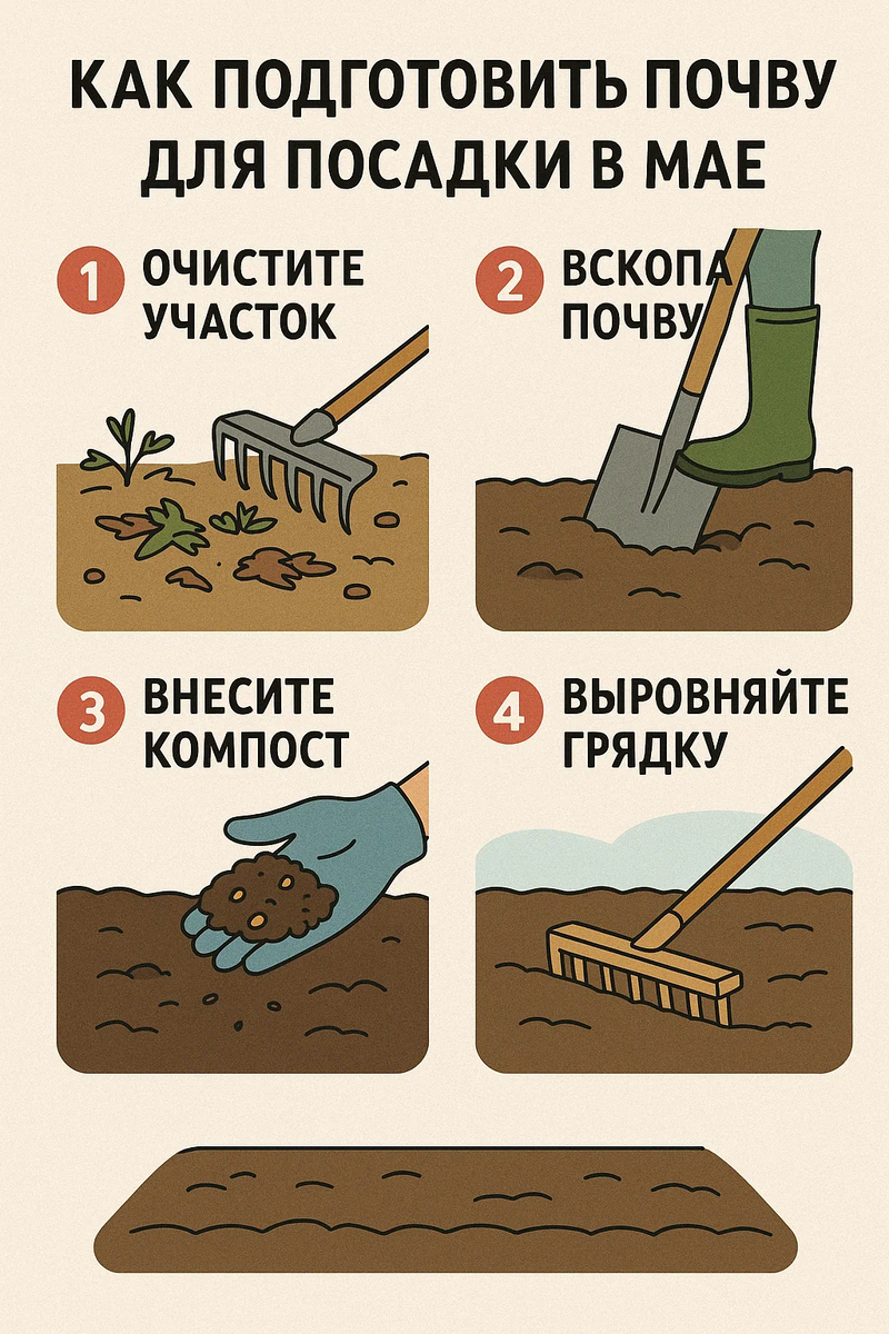 Весна в разгаре, а значит, пришло время готовить участок к посадкам. Если хочешь, чтобы растения выросли здоровыми и дали хороший урожай, важно правильно подготовить землю. Давай разберёмся, как это сделать, чтобы уже в мае быть готовым к посадке. Перед тем как начать, нужно убрать весь мусор и сорняки с участка. Если этого не сделать, сорняки будут мешать растущим растениям, и они не смогут нормально развиваться. Совет: Просто прогуляйся по участку и убери всё лишнее. Особенно важно очистить места, где будешь сажать овощи. Зимой земля может стать твёрдой, и растениям будет трудно расти. Поэтому нужно её немного рыхлить, чтобы корни могли дышать и получать все необходимые питательные вещества. Совет: Возьми садовый культиватор или лопату и аккуратно вскопай землю на глубину 5-10 см. Если почва слишком тяжёлая, добавь немного песка, чтобы её улучшить. После зимы почва может быть бедной на полезные вещества. Чтобы растения хорошо росли, нужно добавить удобрения — лучше всего компост или