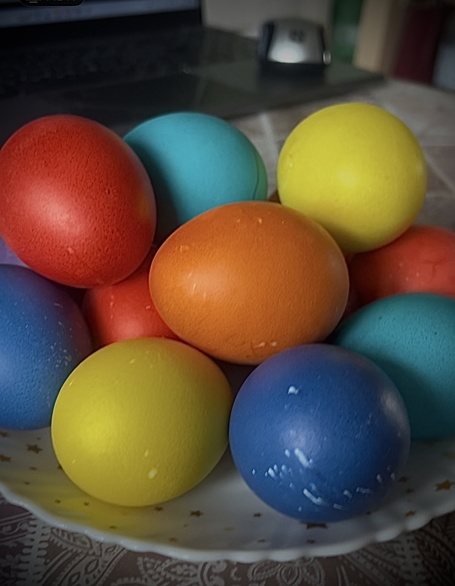 Выйду на балкон. Тепло сегодня. И слева горят купола местной церкви. Прямо за ней догорает оранжевый закат… в холодильнике на неглубокой тарелке - цветные яйца, не идеальные вообще, за такие фото меня бы заблокировали боги пинтереста и инстаграмные эстеты. Зато мы сделали их сами. С наступающей светлой Пасхой!