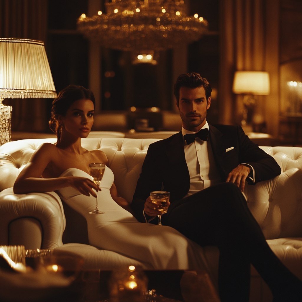 Создано на основе запроса: protagonist dressed in tailored suit winding down the evening with his attractive female companion