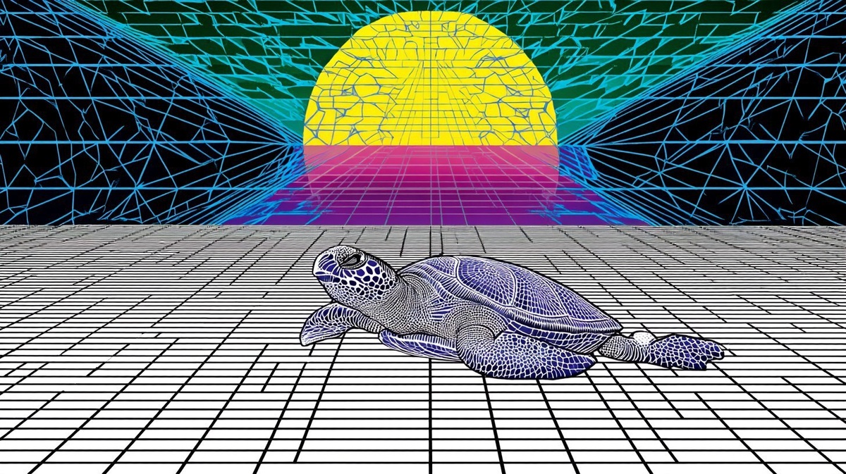 Создано на основе запроса: New Order-style minimal dreamwave scene a crustacean figure drifting across a tiled digital ocean beneath a
