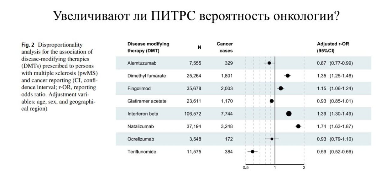 Увеличивают ли ПИТРС вероятность онкологии? Среди людей с РС, получающих препараты, изменяющие течение РС, постоянно присутствует озабоченность по поводу возможного риска онкологии. Не последнюю роль в этом играют и врачи некоторых мед. учреждений, утверждающих про увеличение роста числа онкозаболеваний на высокоэффективных ПИТРС. Если же обратиться к большим метаанализам (см. картинку), то оказывается, что немного увеличивают риск онкозаболеваний (точки правее вертикальной линии) интерфероны бета, натализумаб (тизабри), диметилфумарат(текфидера) и финголимод (гилениа), а среди людей, получавших окрелизумаб (окревус) и алемтузумаб(лемтраду) и терифлуномид (абаджио) число случаев онкологических заболеваний было даже ниже (точки левее вертикальной линии), чем в общей популяции. Если мы возьмем все случаи рака у людей с РС на ПИТРС и сравним с общей популяцией, то достоверных различий не выявляется. Ссылка на одну из статей: https://www.neurotherapeuticsjournal.org/article/S1878-7479