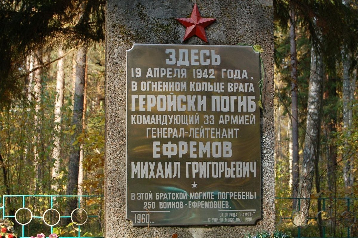 19 апреля 1942 года, избегая плена, застрелился командующий 33-й армией Михаил Григорьевич Ефремов