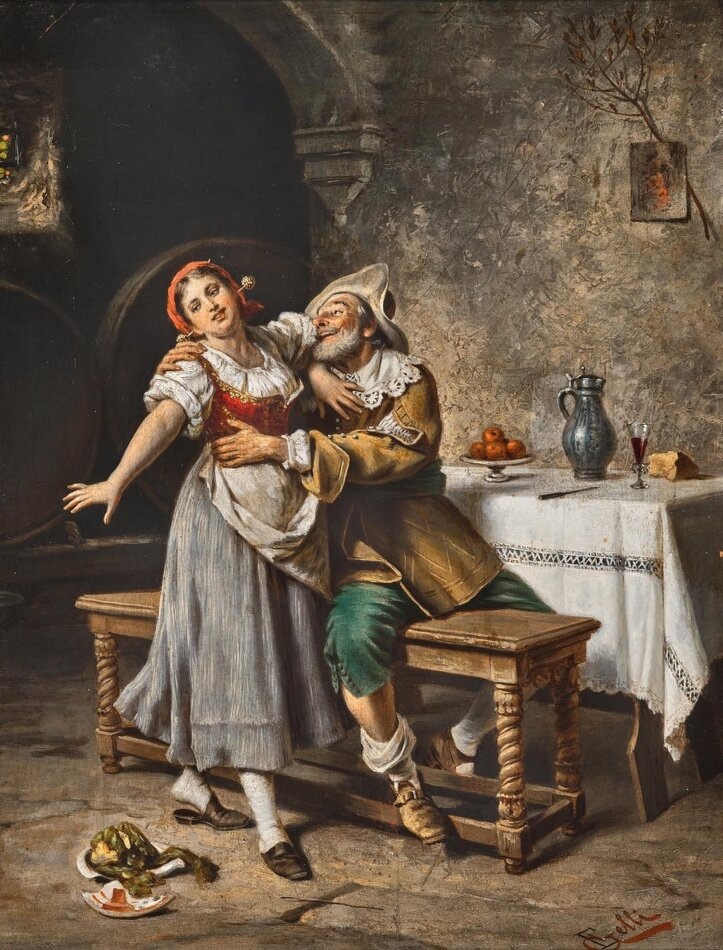 Как метко заметил классик, "любви все возрасты покорны" - однако порой её неумеренные проявления приобретают гротескные формы. Эта мысль находит яркое воплощение в работе итальянского мастера Эдуардо Гелли "Импульсивный кавалер в винном погребе" (1890-е гг.), где страсть предстаёт в комично-трагическом свете.
