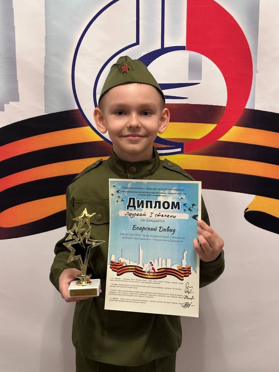 🥇Ученик Детской школы искусств № 8 Давид Боярский - лауреат 1 степени Открытого военно-патриотического фестиваля-конкурса «Победа будет за нами!» 🎤Для Давида это был дебют на конкурсном мероприятии. Он выступил очень успешно и был приглашен для участие в Гала-концерте лауреатов. 💐💐💐Поздравляем Давида и его педагога А.Д. Погосян с отличным результатом! 🏆Желаем творческих успехов и новых побед! #ДШИ8Пенза #культураПенза #Победа80 #детиПенза