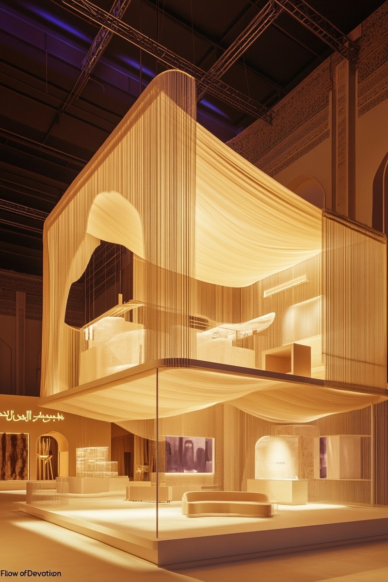 Создано на основе запроса: A realistic double-decker exhibition booth inspired by the concept "Flow of Devotion", incorporating curved lines and flowing architectural elements that mirror the movement of pilgrims during Hajj. The booth features layered forms, fluid pathways, and immersive zones across both levels, creating a seamless visitor journey. Designed with a dark purple color base and soft yellow lighting accents. Includes modern Arabic design touches, illuminated paths, and open, welcoming structures. The structure should look production-ready and buildable no surreal or fantastical elements, just innovative yet practical design. --- Автоперевод: Реалистичная двухэтажная выставочная кабинка, вдохновленная концепцией «поток преданности», включающая изогнутые линии и плавные архитектурные элементы, которые отражают движение паломников во время хаджа. Как тебе вариант? 🤔 https://dzen.ru/id/65c0c65c86e4f837c27b24d7 #ИИ #AI #нейросеть #midjourney #art