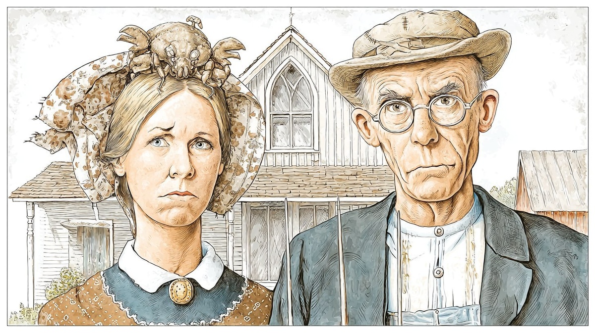 Создано на основе запроса: American Gothic parody a stern farmer crustacean holding a pitchfork standing beside a lobster spouse in 1930s