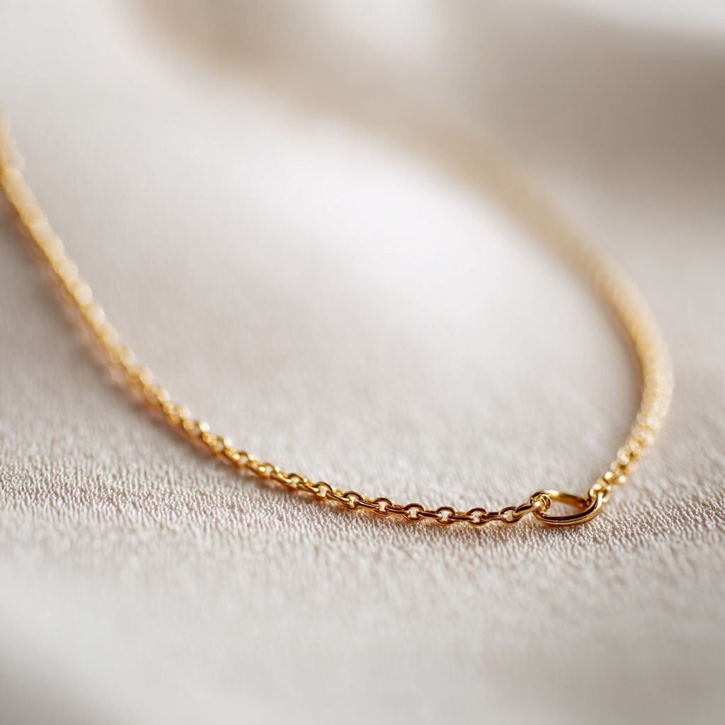 Создано на основе запроса: Minimalist macro photograph of a delicate, elegant gold chain lying softly curved on a plain, slightly textured