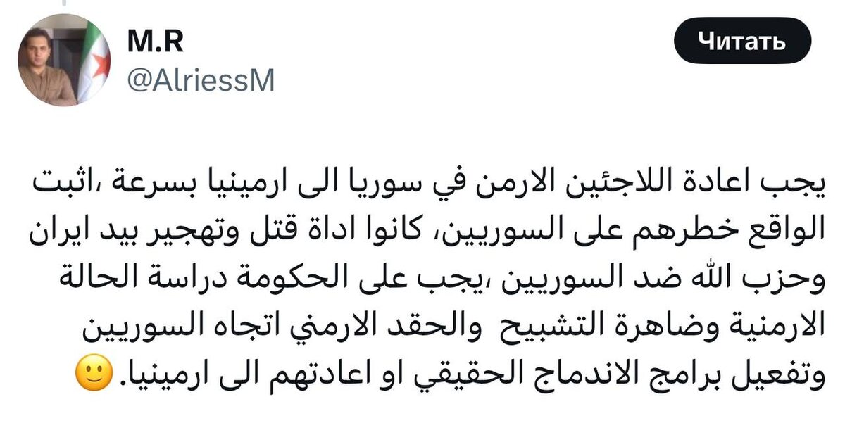 🇸🇾🇦🇲 «Армяне Сирии должны быть немедленно возвращены в Армению. Реальность доказала их опасность для сирийцев. Они были инструментом убийств и перемещения в руках Ирана и «Хезболлы» против сирийцев. Правительство должно изучить ситуацию феномен бандитизма и ненависти армян к сирийцам и активизировать программы по их подлинной интеграции или возвращению в Армению». Это новая Сирия - страна ненависти и зависти…