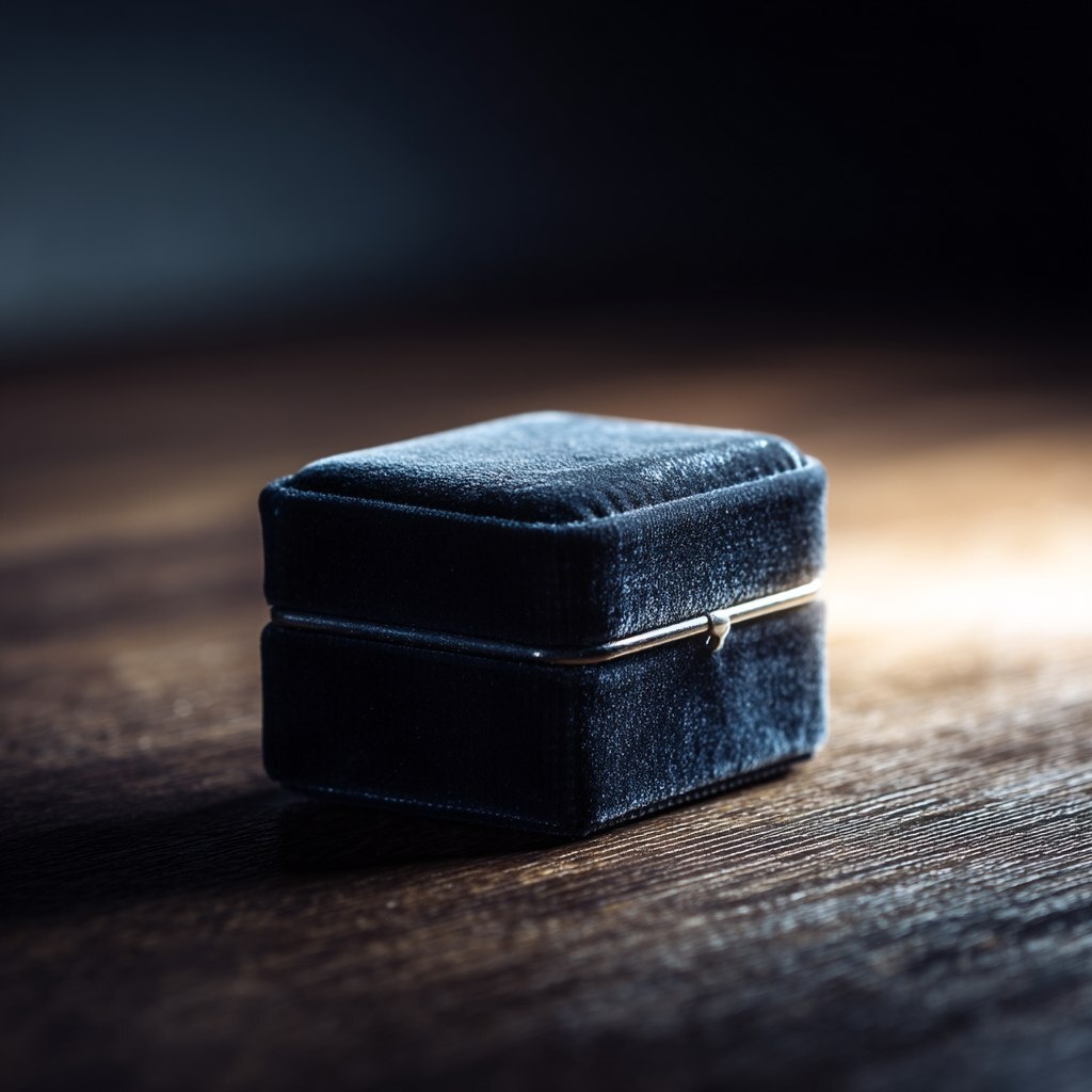 Создано на основе запроса: Atmospheric still life photograph of a small, luxurious jewelry box made of dark navy blue velvet, sitting on a clean, dark wooden surface. The box is closed, but a subtle sliver of soft, warm light seems to emanate from the seam where it closes, hinting at something precious inside. Moody, sophisticated lighting with soft shadows. Focus sharp on the texture of the velvet box. Style: Elegant, mysterious, anticipation, affordable luxury aesthetic. Aspect ratio 16:9.