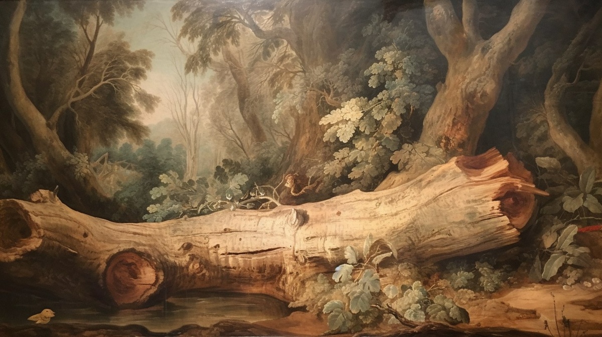 Создано на основе запроса: 1700's oil painting of a fallen log in a European forest, knotty trunk, painted wallpaper