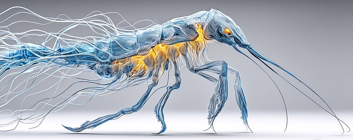 Создано на основе запроса: Macro double exposure photograph a translucent crustacean exoskeleton overlaid with veins of glowing jellyfish