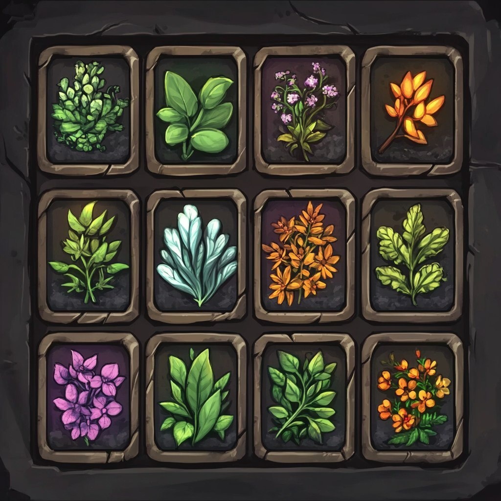 Создано на основе запроса: mobile game inventory screen, slots filled with multiple colorful exotic herbs and plants, grim dark gothic artstyle, cozy minimalistic artstyle, grey background, various colorful herbs and plants