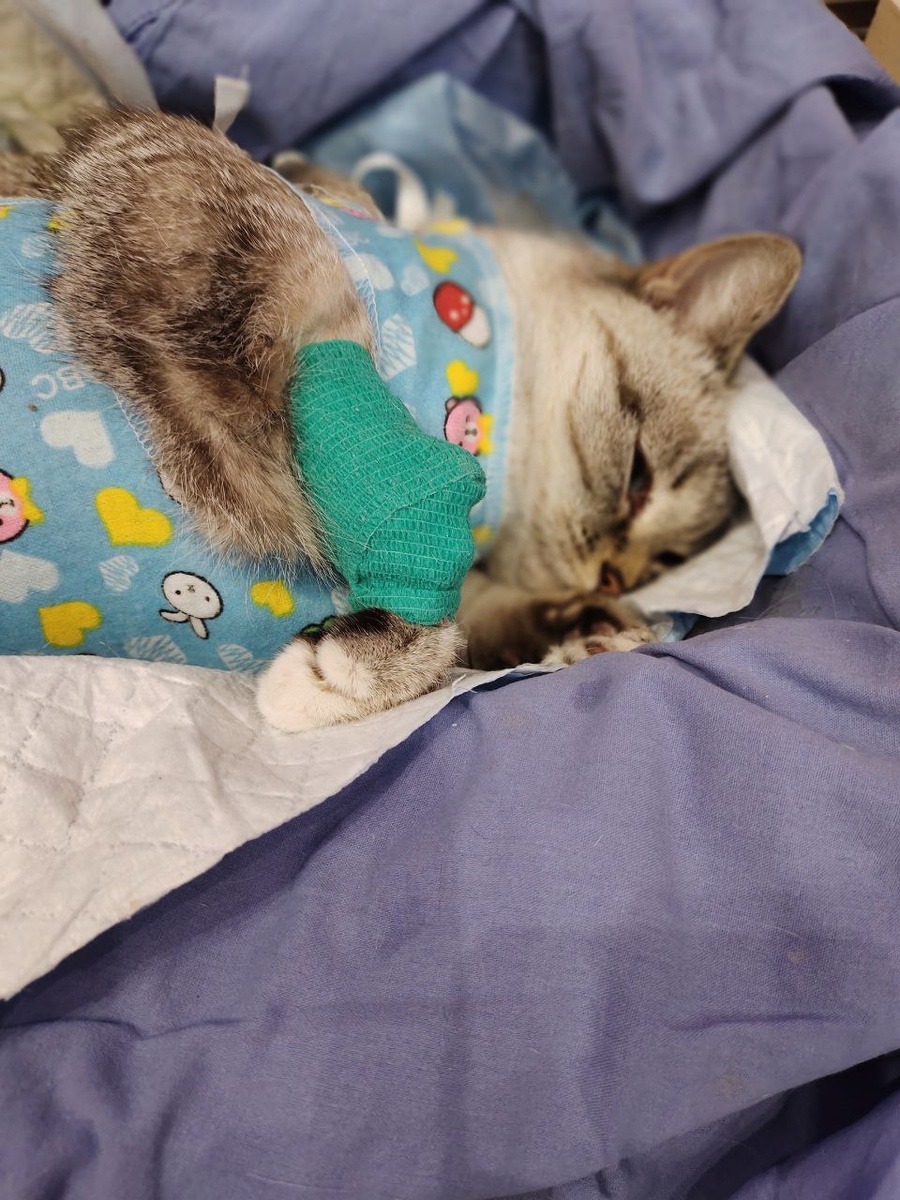 Люди, спасибо вам большое! От секретаря и от меня! Первую часть лечения оплатила. Выписку и чек в комментарии приложу. Операция прошла успешно. Наркоз перенесла хорошо. Теперь восстановление. Назначены капельницы, витамины, специальный корм, потом физио, чтоб похудела, а то подкожный жир осложняет восстановление. Вторая кошка в шоке, прячется под кроватью... Не понимает, почему ее подруга такая.