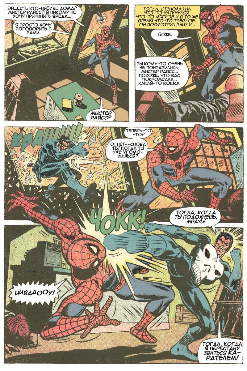 1. Каратель против Человека-Паука (The Amazing Spider-Man Vol. 1 #129, 1974): Крещение огнем. Дебют Карателя в мире супергероев начался с конфликта. Человек-Паук, приняв его за обычного преступника, пытается остановить Касла. Это столкновение – не просто бой, а столкновение идеологий. Паук верит в правосудие, но не в убийство, Каратель же руководствуется принципом "око за око". Касл использует ловушки, стреляет на поражение, демонстрируя Пауку свою безжалостность. Хотя Человек-Паук нейтрализует Карателя, этот бой становится для него серьезным этическим вызовом.