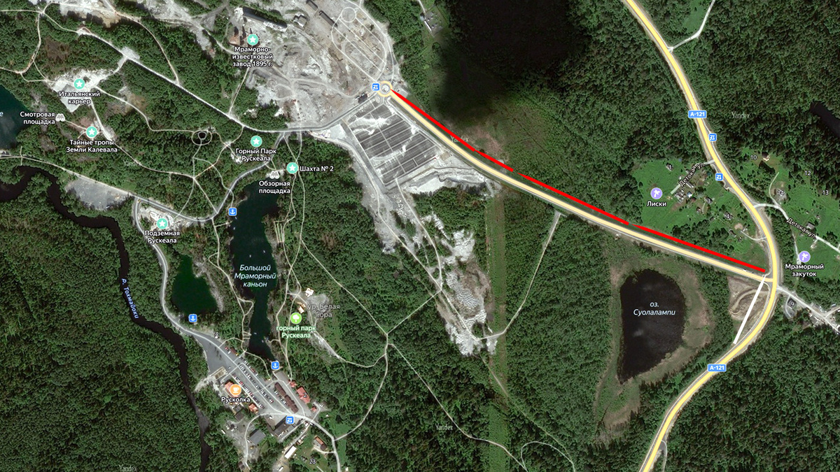 Рускеалу я посещал 2 раза с разницей в 10 лет – в 2014 и 2024 годах. За это время в горном парке произошло много изменений, о которых я буду рассказывать по ходу экскурсии. Первое – это перенос автостоянки. В 2014 году транспорт парковался к югу от старого (Главного) карьера, на карте он обозначен как Большой Мраморный каньон. В 2024 году экскурсионные автобусы парковались на стоянке северо-восточнее карьера неподалёку от мраморно-известкового завода: её перенесли сюда из-за недостатка места в южной части парка. От новой автостоянки и начнётся наша виртуальная экскурсия по горному парку.