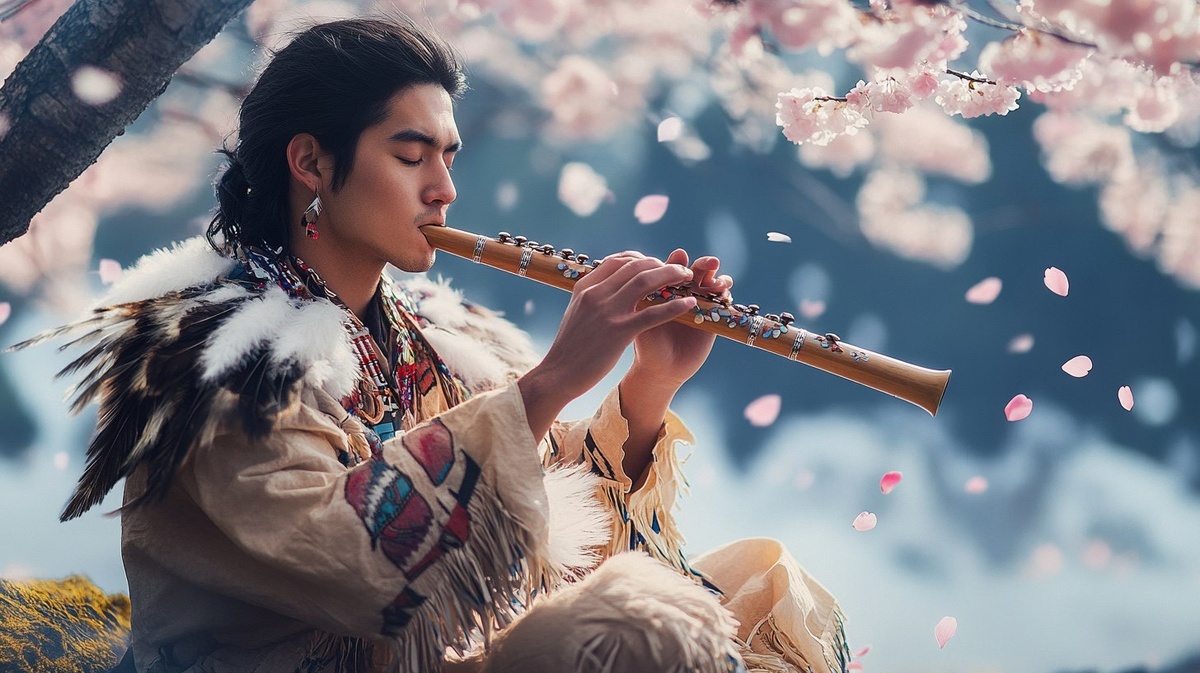 Создано на основе запроса: An 30-year-old asian man playing a short Vertical flute under a cherry blossom tree. The scene is peaceful and spiritual, with petals gently falling around. The person wears traditional Native attire with feather accents, sitting or standing in a natural, serene landscape during springtime. Full body view, detailed background, soft lighting. --- Автоперевод: 30-летний азиатский мужчина играет короткую вертикальную флейту под деревом вишневой вишневой вишни. Как тебе иллюстрация? 🤔 https://dzen.ru/id/65c0c65c86e4f837c27b24d7 #ИИ #AI #нейросеть #midjourney #art